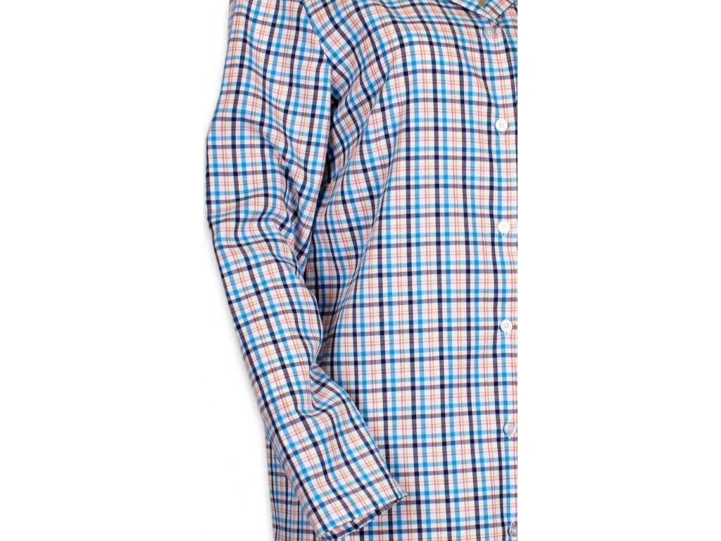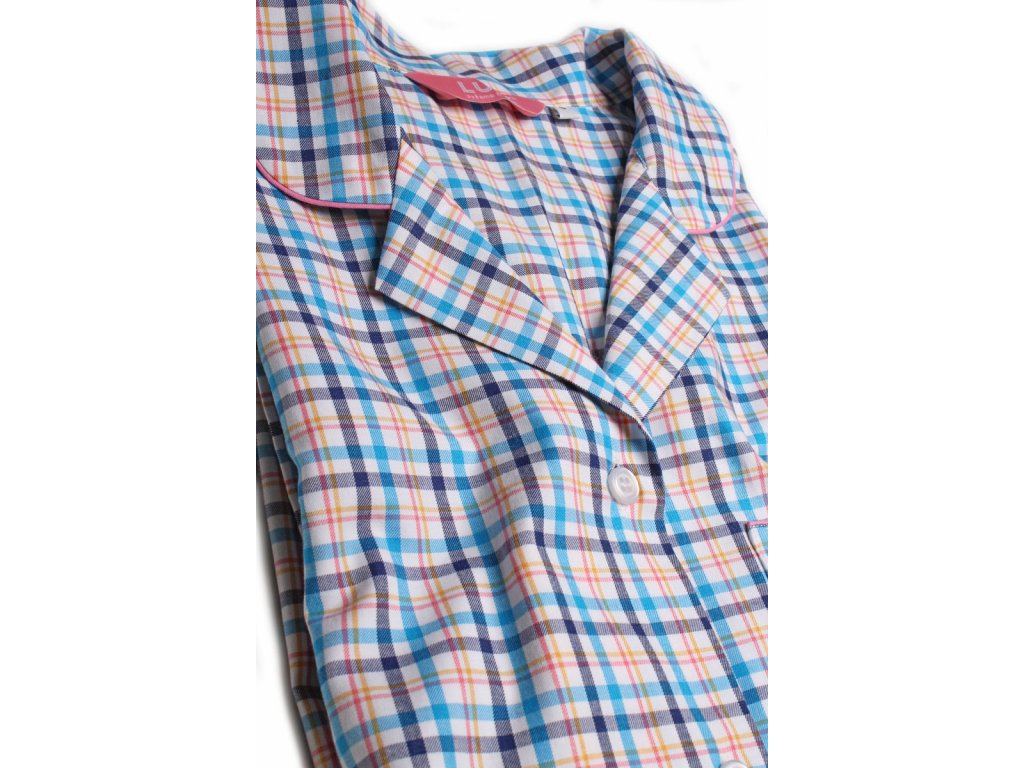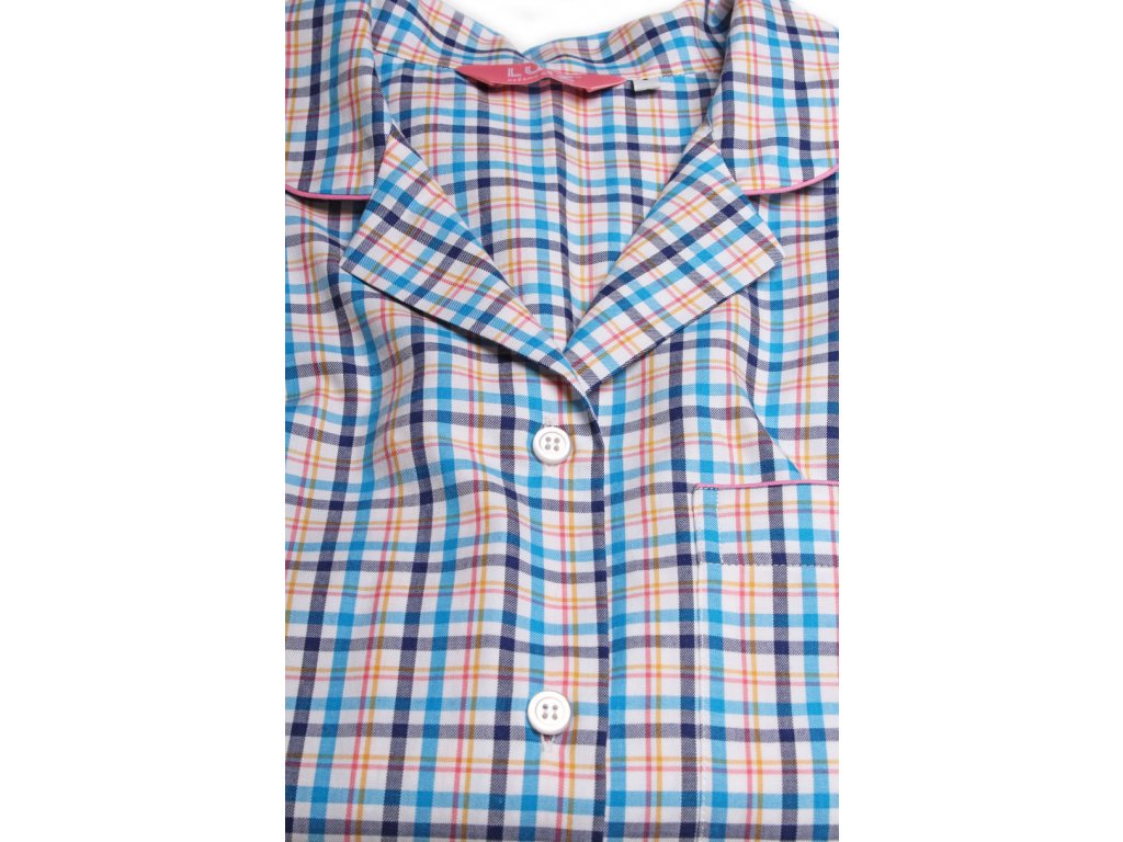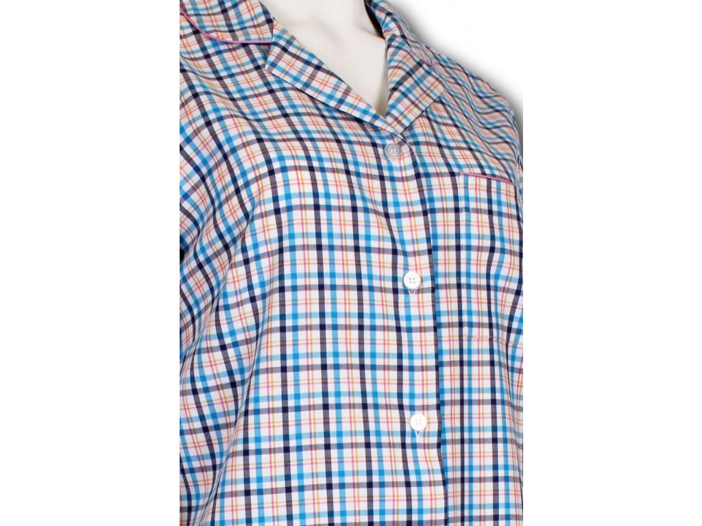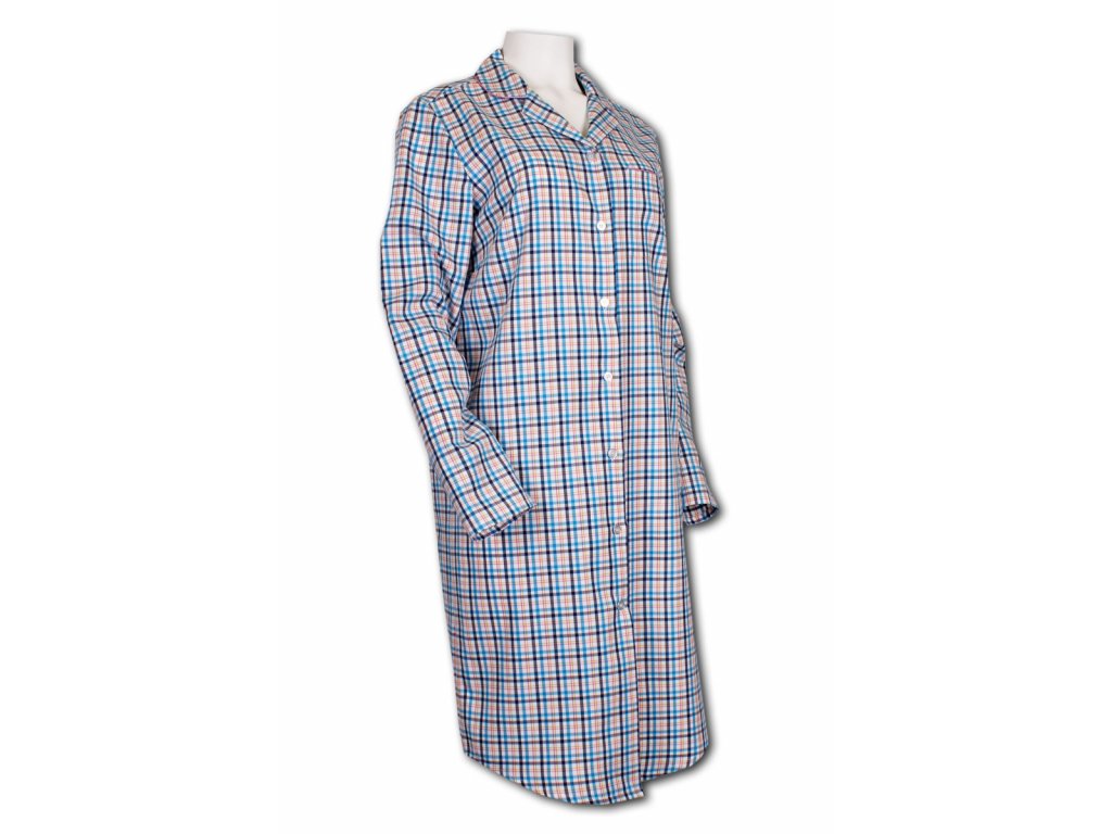 Dámská noční košile z kvalitního pestře tkaného popelínu. S dlouhým rukávem a límečkem do rozhalenky. Košile je propínací na knoflíčky s krásným kostkovaným vzorem a kapsou na předním díle. Velmi pohodlná a hřejivá.