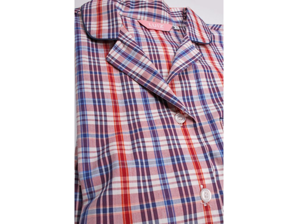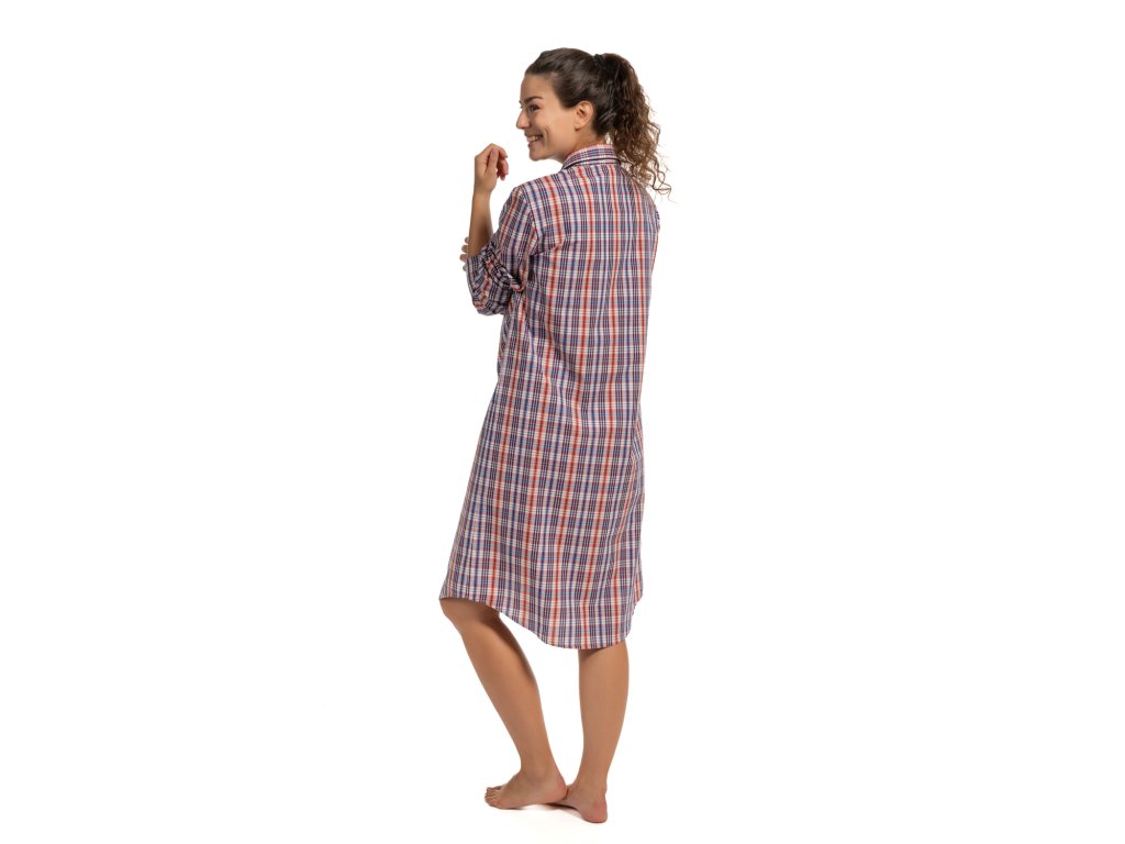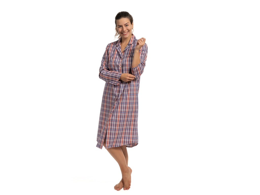 Dámská noční košile z kvalitního pestře tkaného popelínu. S dlouhým rukávem a límečkem do rozhalenky. Košile je propínací na knoflíčky s krásným kostkovaným vzorem a kapsou na předním díle. Velmi pohodlná a hřejivá.