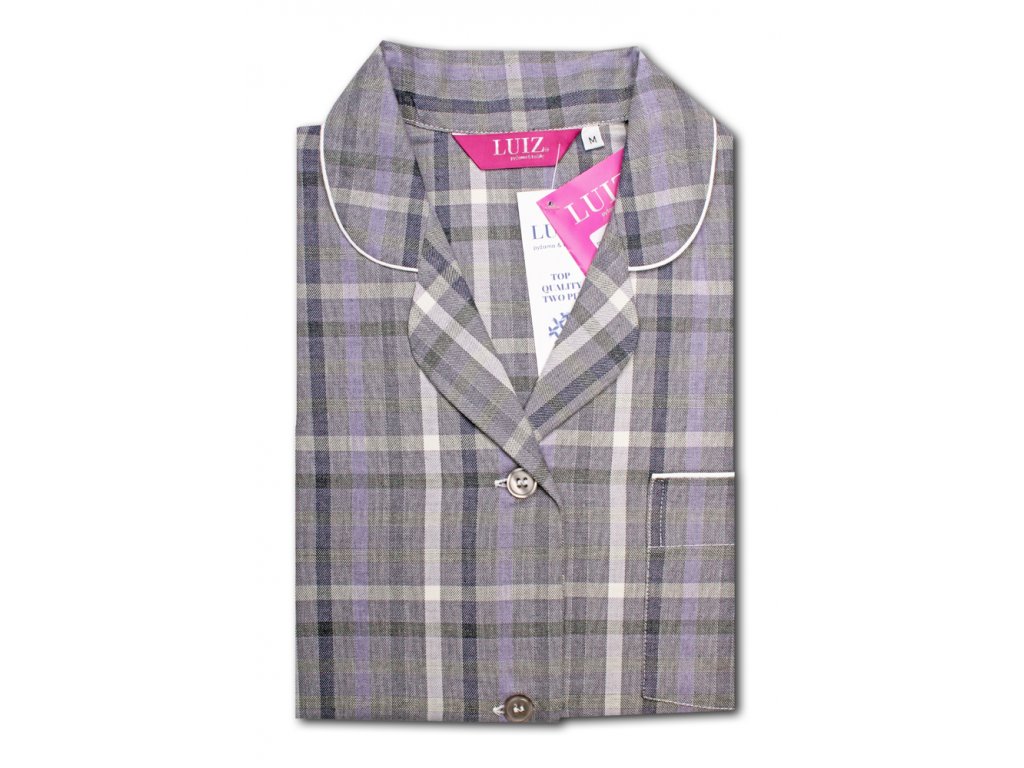 Bílý a světle fialový vzor na šedém podkladu, pyžamo je lemované bílou paspulí.