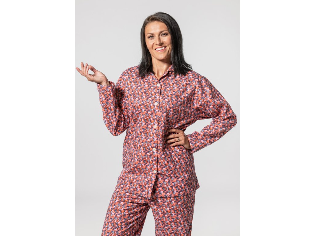 Dámské pyžamo Andrea s kvalitního oboustranně česaného flanelu, který je příjemný jak na tělo tak a omak. Pyžamo má dlouhé nohavice i rukáv. Kabátek na knoflíky, u krku s rozhalenkou, jedna menší kapsa v délce. kalhoty do široké navlečené gumy, kterou si můžete vyměnit.