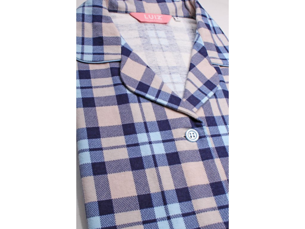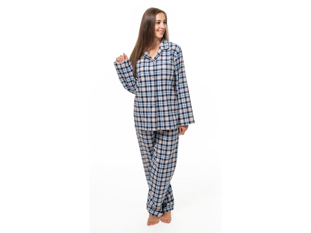 Dámské pyžamo na knoflíky v zajímavém provedení i zpracování. Pyžamo je s dlouhým rukávem i nohavicí, lemované ozdobnou paspulkou. Kabátek je s rozhalenkou a malou kapsičkou na prsou, kalhoty v pase do široké prošité gumy s navlečenou šňůrkou, pro případné stáhnutí v pase.