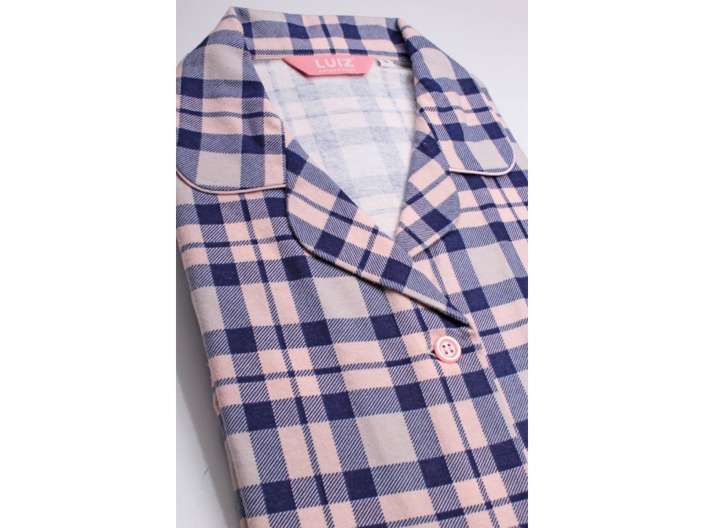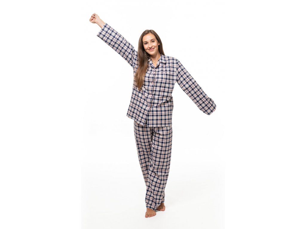 Dámské pyžamo na propínání v zajímavém provedení i zpracování. Pyžamo je s dlouhým rukávem i nohavicí, lemované ozdobnou paspulkou. Kabátek je s rozhalenkou a malou kapsičkou na prsou, kalhoty v pase do široké prošité gumy s navlečenou šňůrkou, pro případné stáhnutí v pase.