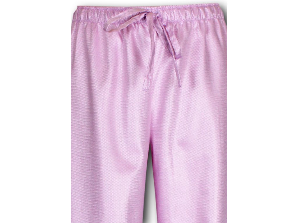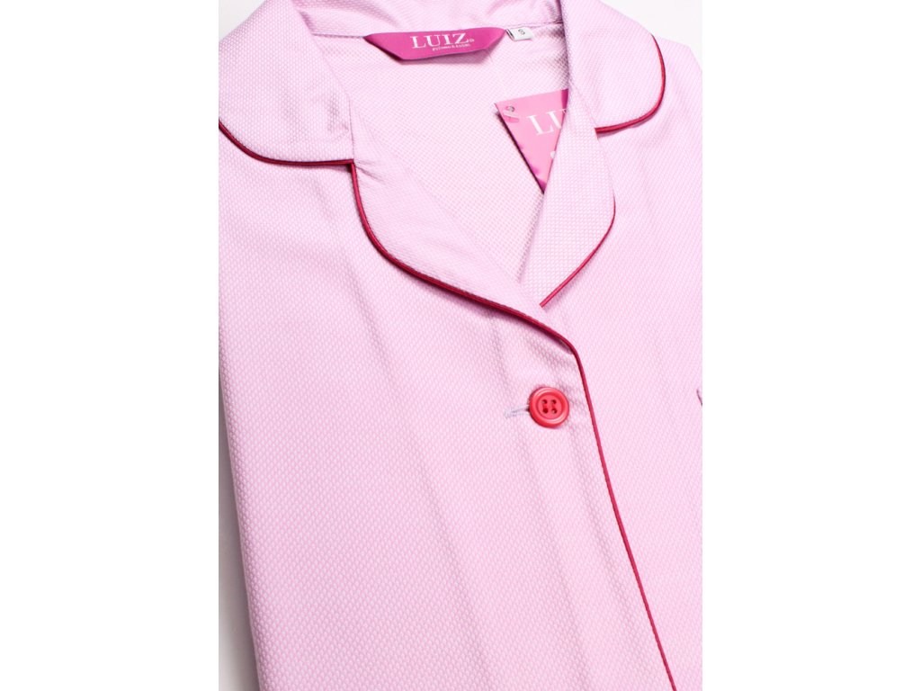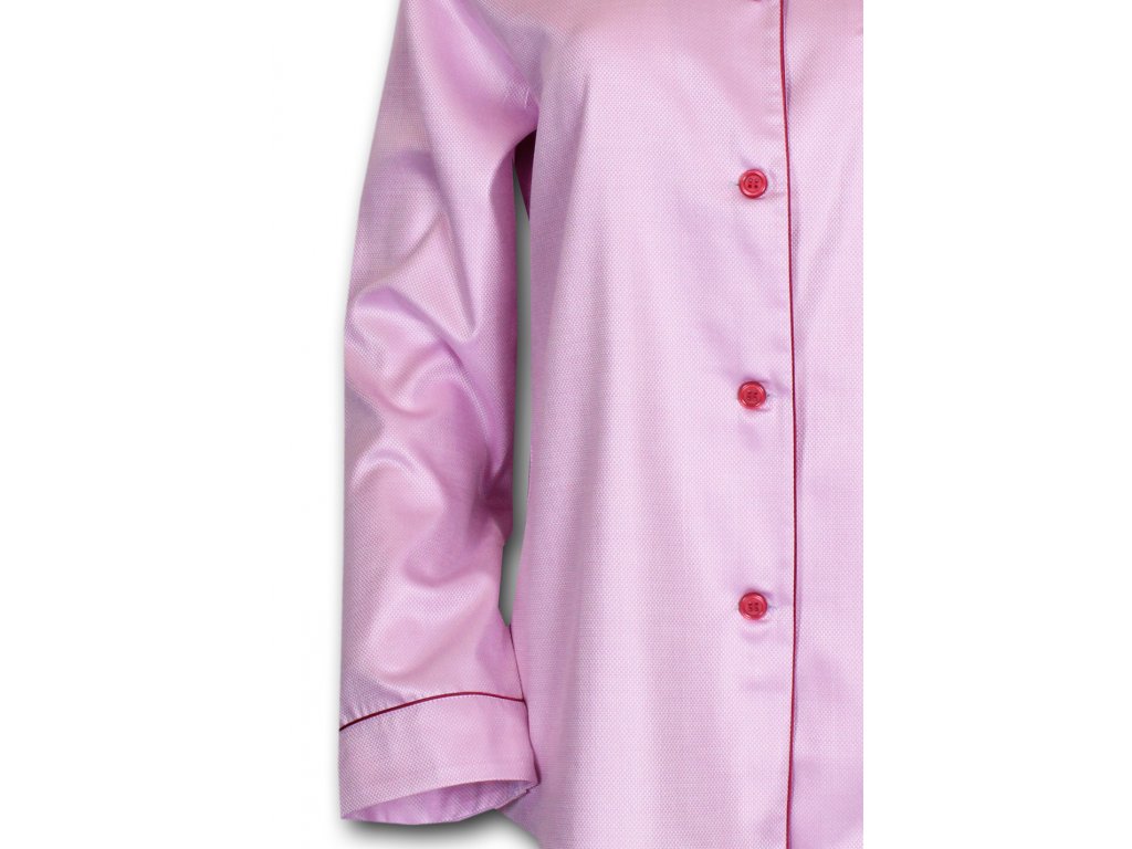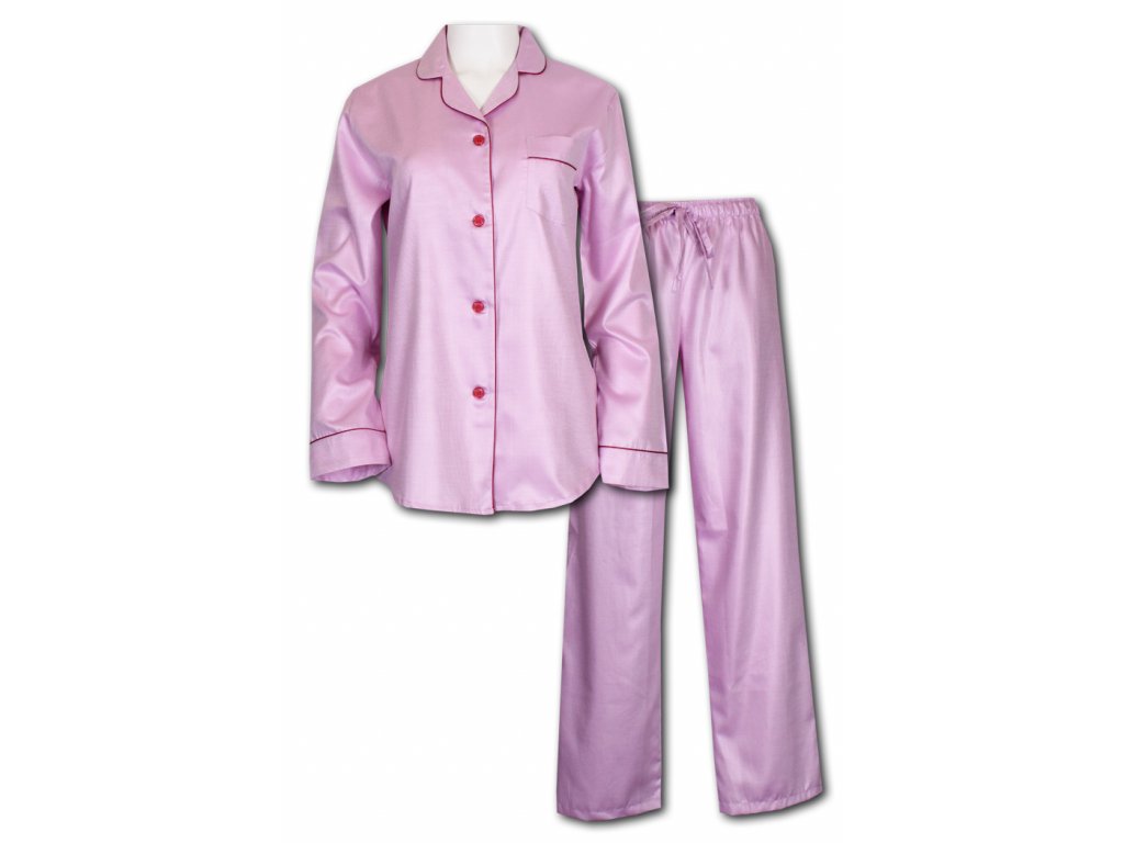 Elegantní dámské pyžamo na propínání v zajímavém provedení i zpracování. Pyžamo je s dlouhým rukávem i nohavicí, lemované ozdobnou paspulkou v barvě látky. Kabátek je s rozhalenkou a malou kapsičkou na prsou. Kabátek je projmutý (zeštíhlený v pase). Kalhoty v pase do gumy s navlečenou šňůrkou.