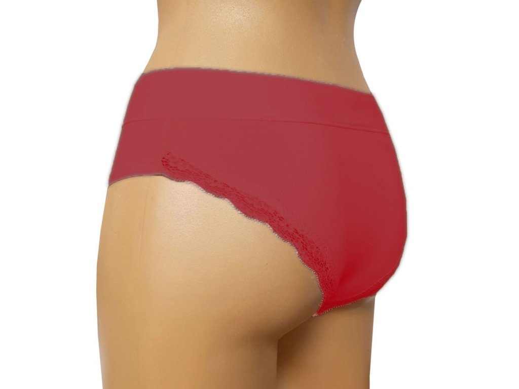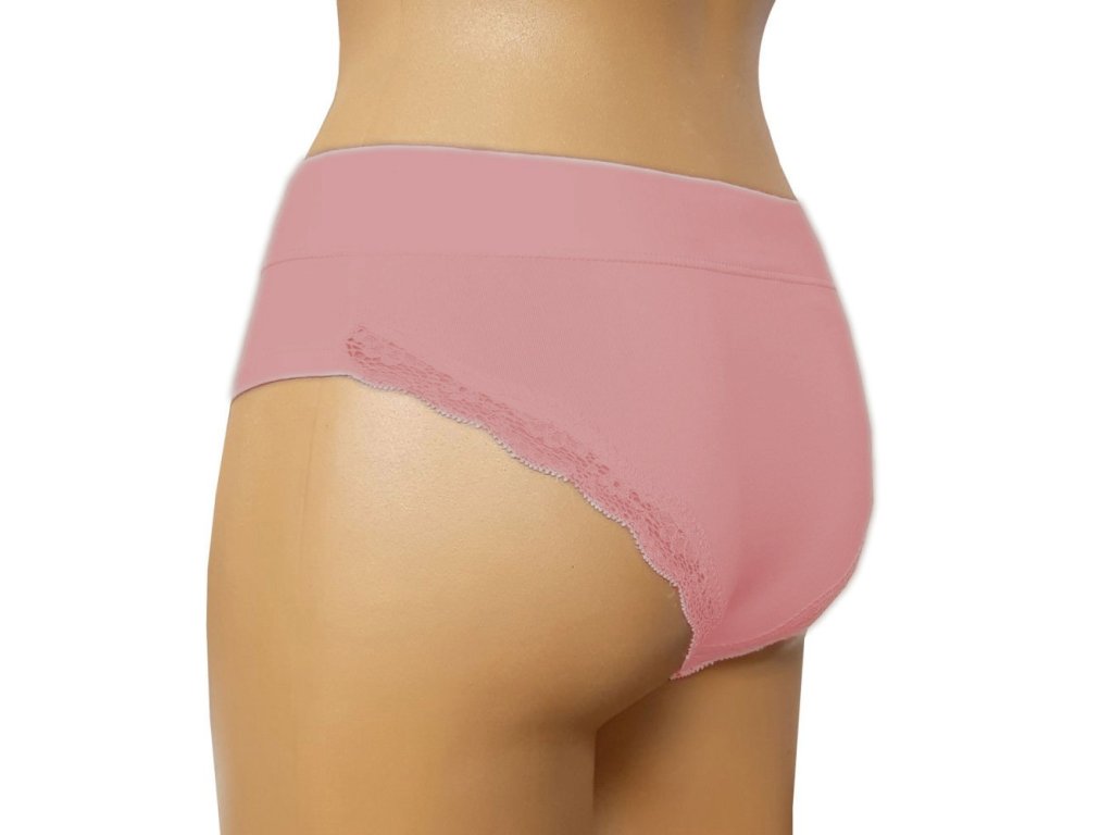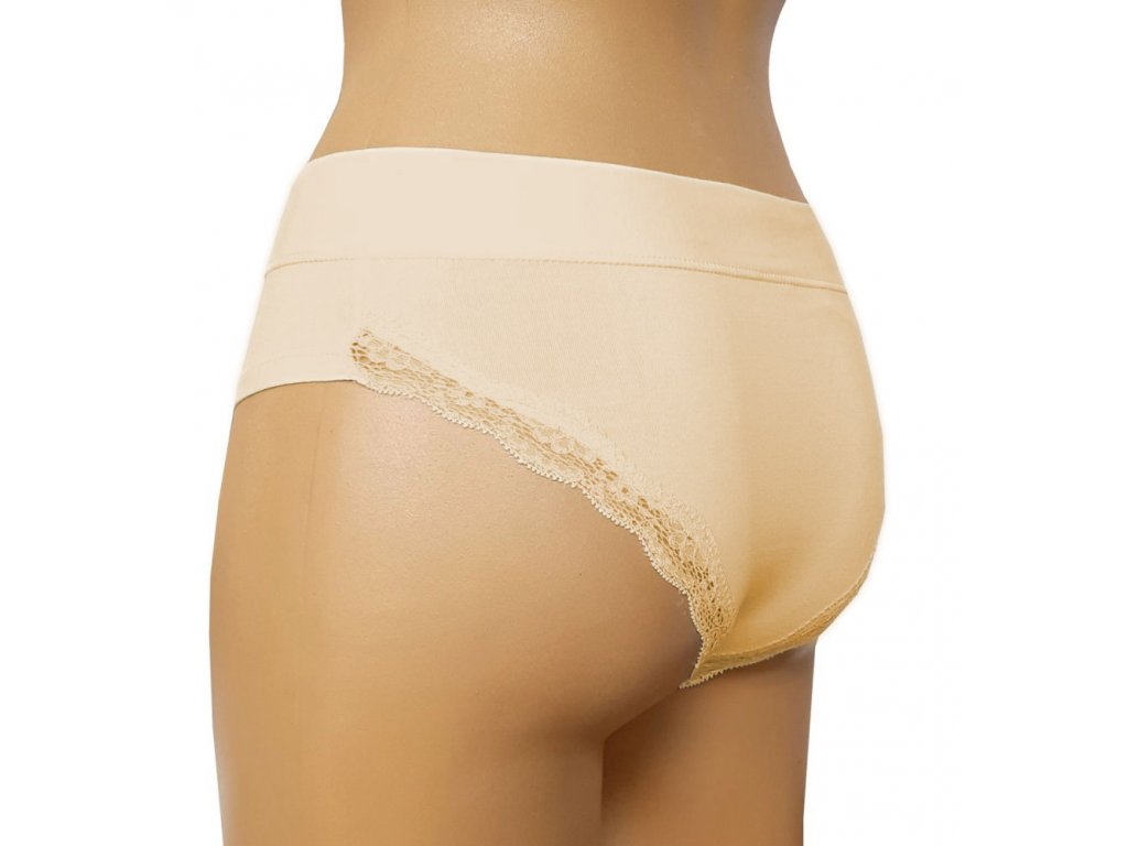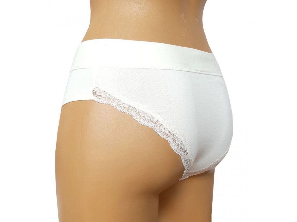 Kalhotky s decentní měkkou krajkou kolem okraje zadečku se sníženým pasem.
