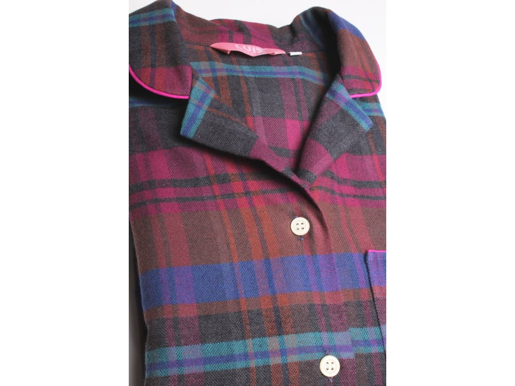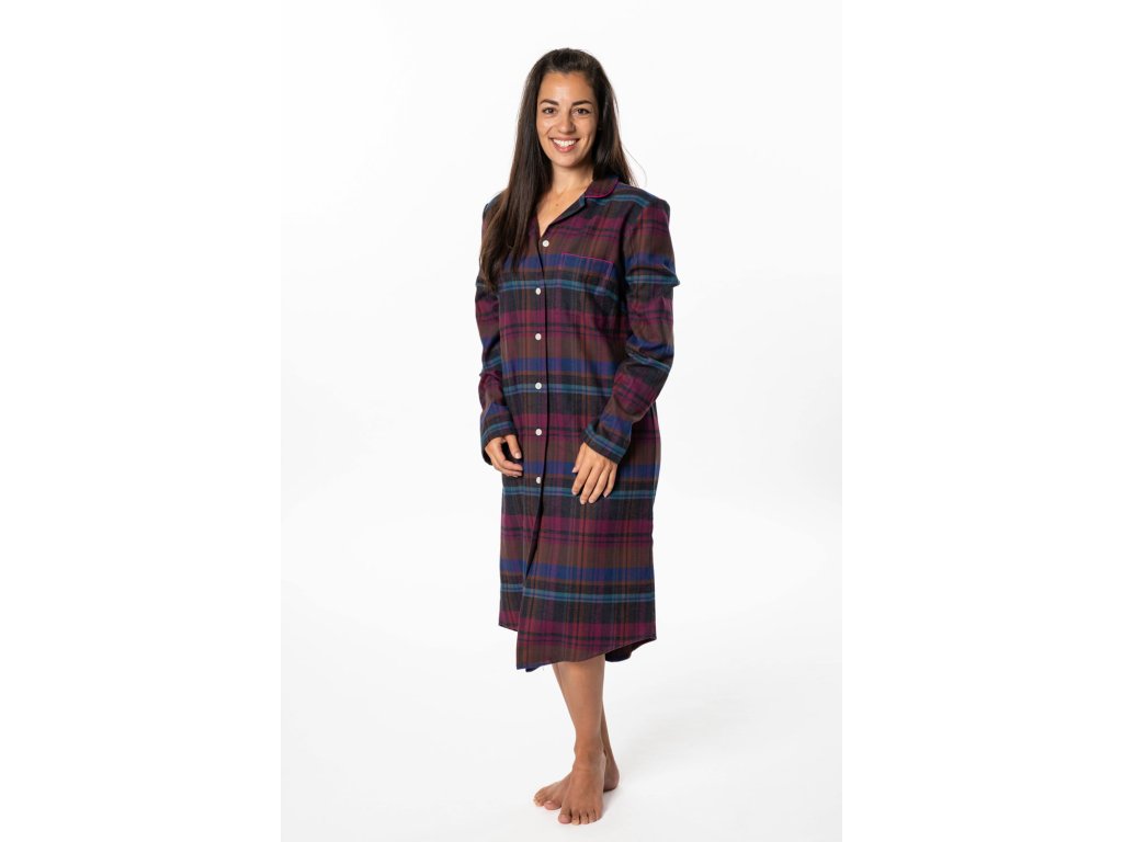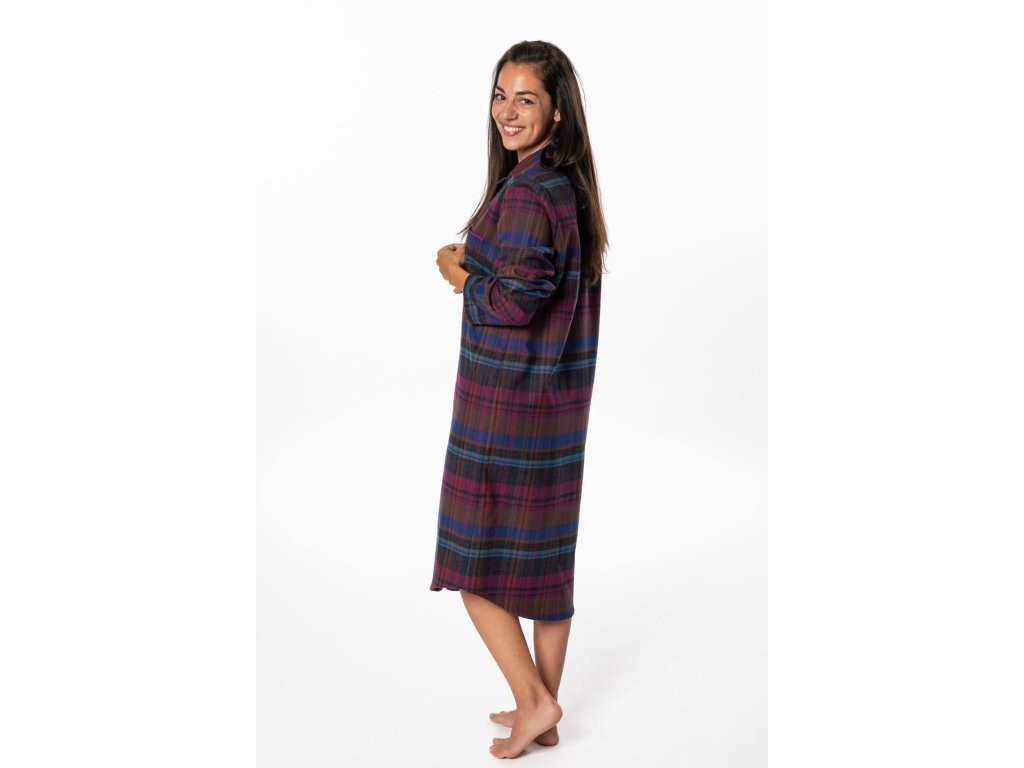 Dámská noční košile z kvalitního pestře tkaného flanelu, který je česaný z obou stran. S dlouhým rukávem a límečkem do rozhalenky. Košile je propínací na knoflíčky s krásným kostkovaným vzorem a kapsou na předním díle. Velmi pohodlná a hřejivá.