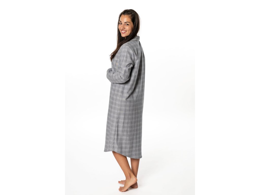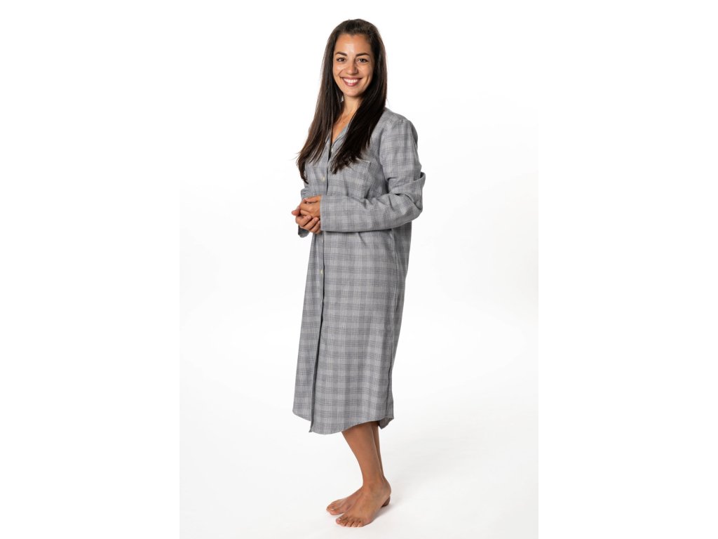Dámská noční košile z kvalitního pestře tkaného flanelu, který je česaný z obou stran. S dlouhým rukávem a límečkem do rozhalenky. Košile je propínací na knoflíčky s krásným kostkovaným vzorem a kapsou na předním díle. Velmi pohodlná a hřejivá.