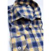 Tmavě modrý podklad s bílým a žlutým kárem, jemný proužek světle růžový.