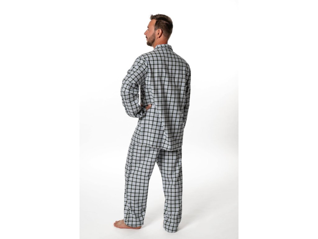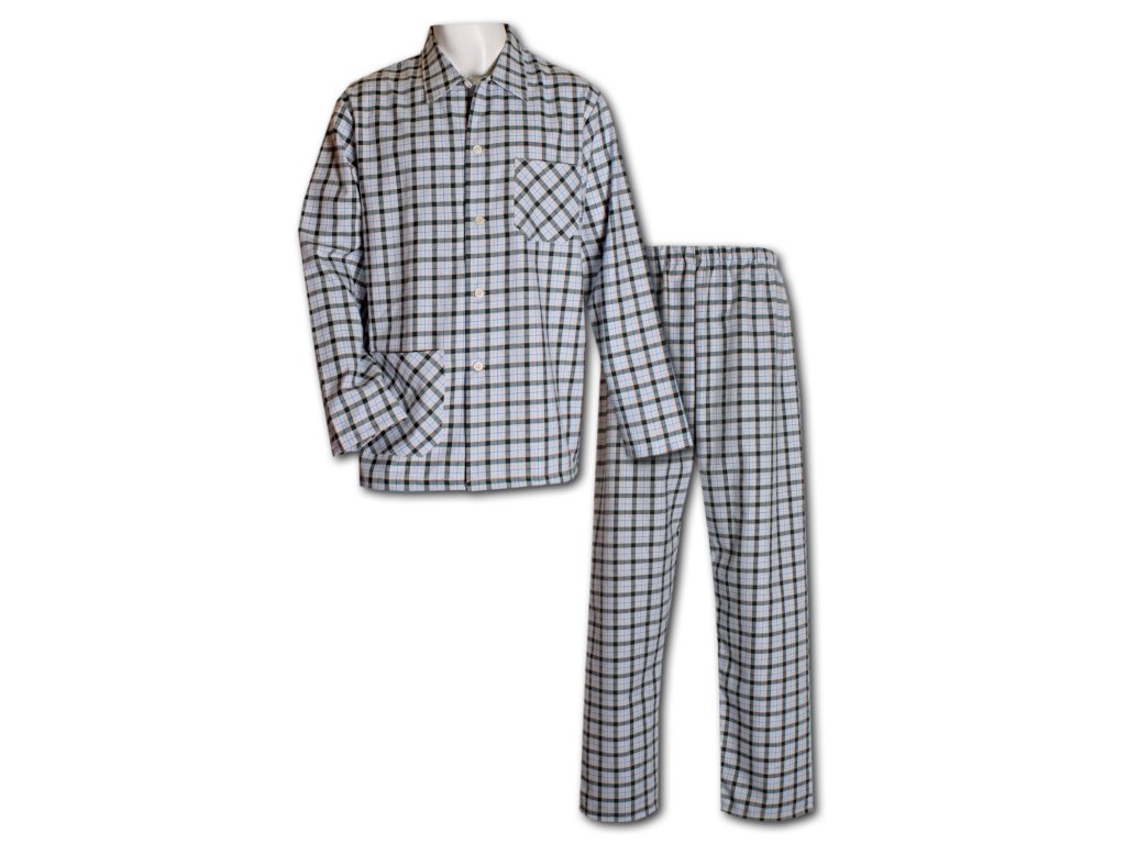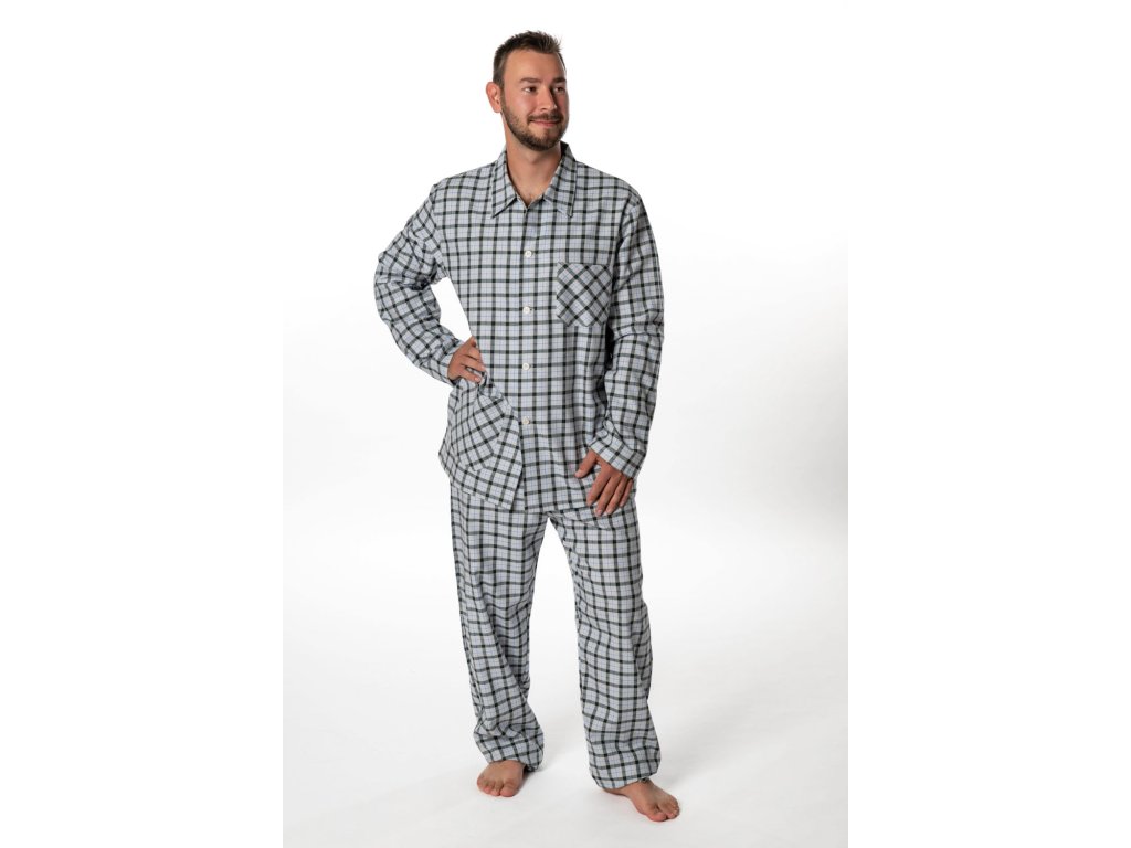 Pánské flanelové pyžamo Jirka TOP na knoflíky v jednoduchém zpracování. Pyžamo je s dlouhým rukávem i nohavicí. Kabátek je se zapínám až ke krku s kapsami na hrudníku a v délce. Kalhoty v pase do široké gumy, která se dá v případě potřeby vyměnit, není prošitá.
