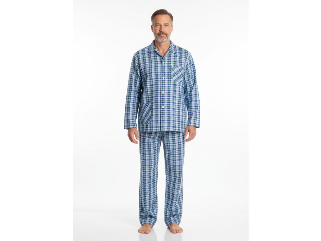Pánské flanelové pyžamo Jirka na propínání v jednoduchém zpracování. Pyžamo je s dlouhým rukávem i nohavicí. Kabátek zapínání ke krku a kapsami na hrudníku a v délce, kalhoty v pase do široké gumy, která se dá v případě potřeby vyměnit.