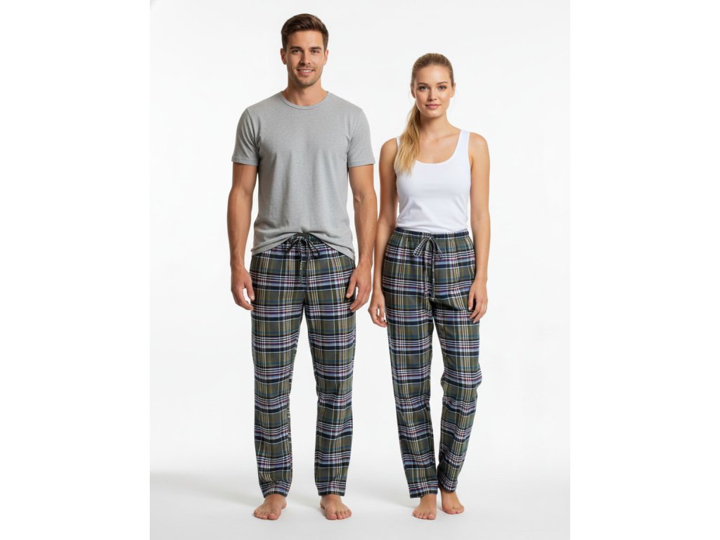 Pánské dlouhé domácí kalhoty, vhodné na spaní i na běžné nošení na doma. Příjemný volný střih z teplého kvalitního pestře tkaného flanelu. V pase na gumu a šňůrku. Pohodlné kapsy na bocích.