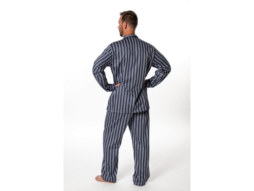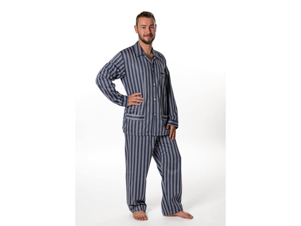 Elegantní pánské pyžamo Alex na propínání, vyrobený z luxusního bavlněného popelínu se saténovým vzorem. Pyžamo je s dlouhým rukávem i nohavicí. Kabátek je s rozhalenkou a třemi kapsami, kalhoty v pase do gumy. Toto pyžamo je elegantní a velmi slušivé, satén dodá pyžamu šarm a eleganci.