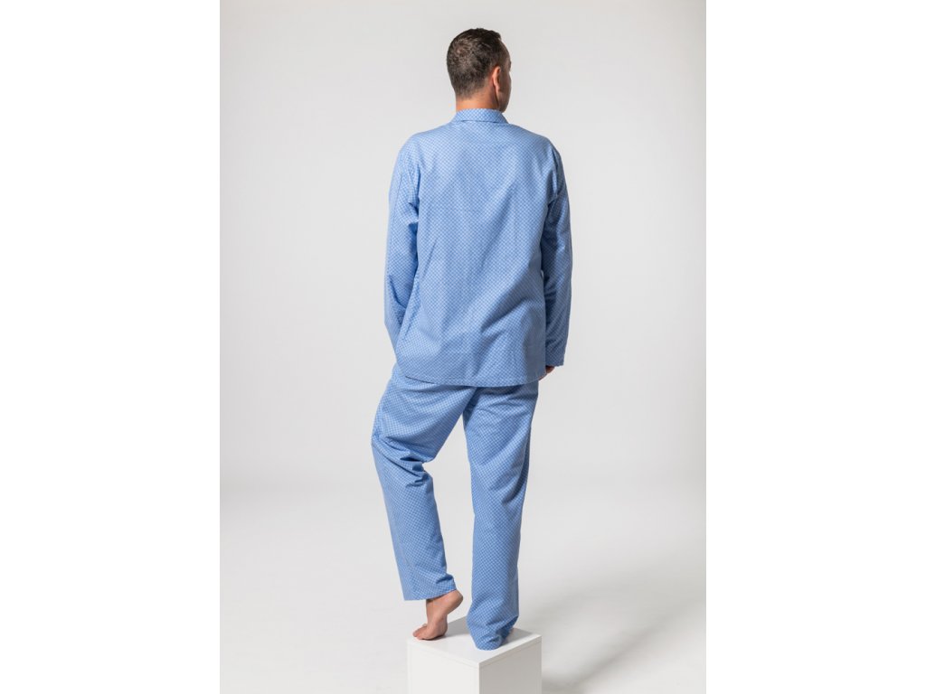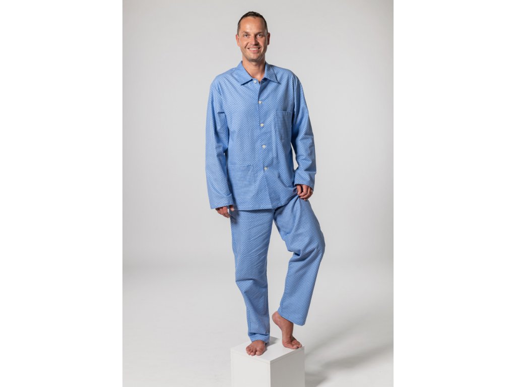 Pánské flanelové pyžamo Jirka na knoflíky v jednoduchém zpracování. Pyžamo je s dlouhým rukávem i nohavicí. Kabátek je s rozhalenkou a kapsami na hrudníku a v délce, kalhoty v pase do široké gumy, která je navlečená v dutince a dá se v případě potřeby vyměnit.