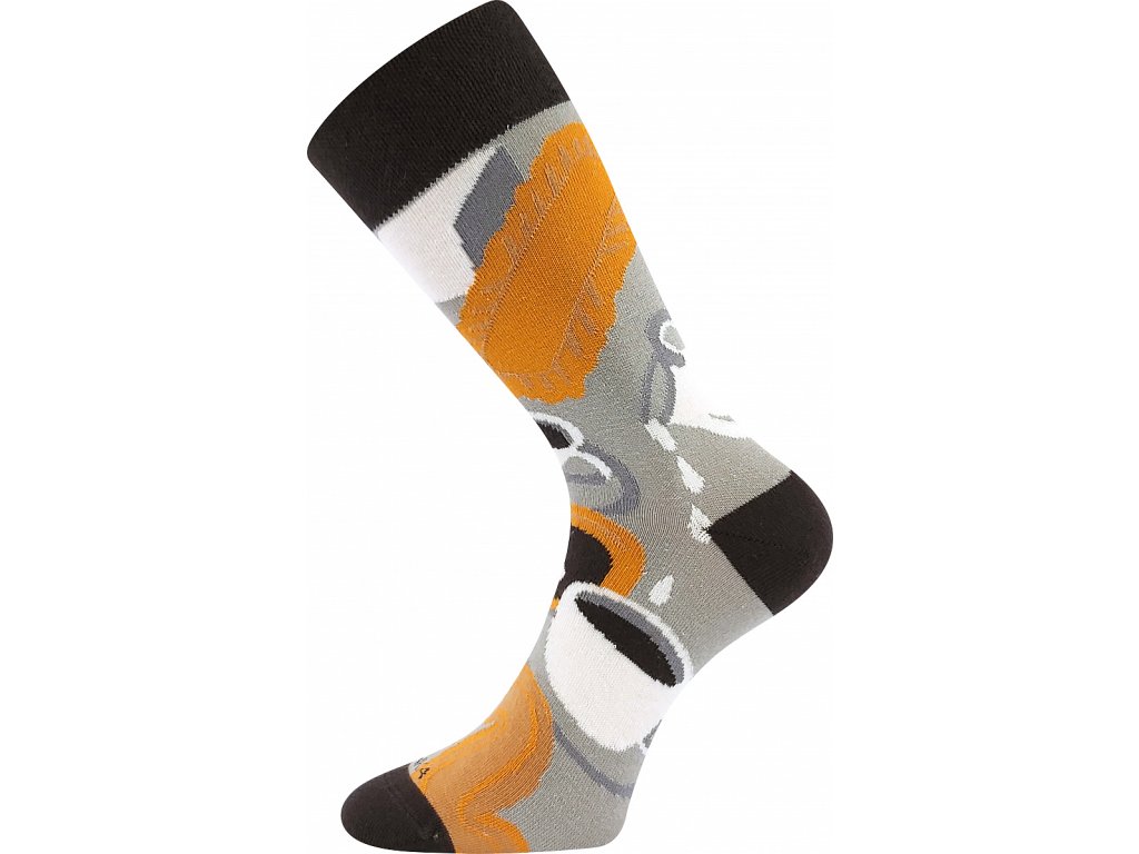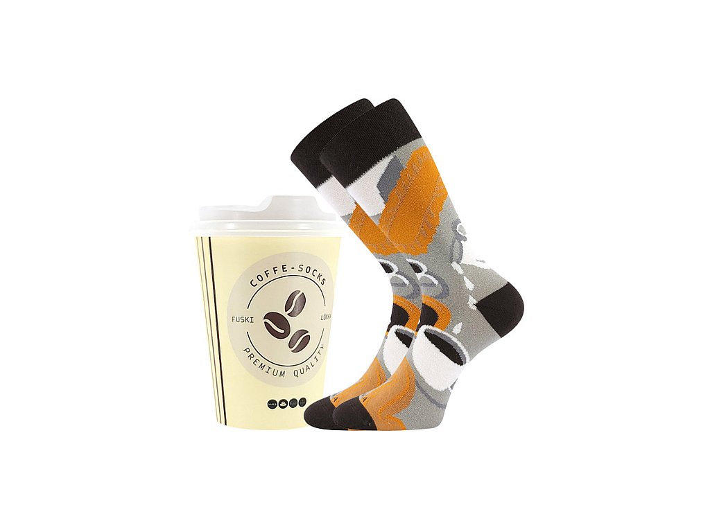 Šedá ponožka s motivem ranní kávy s mlékem. Špička, pata a lem jsou v černé barvě.