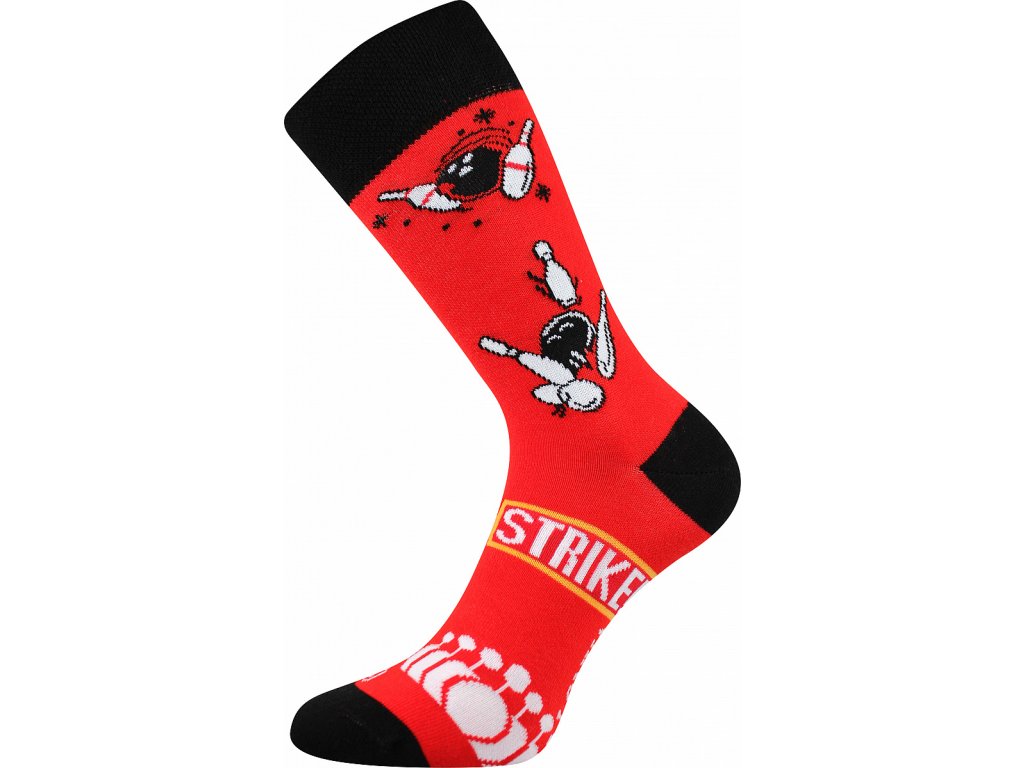 Červené ponožky s černým lemem, a se vzorem bowlingu a kuželek.