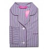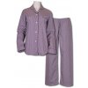 Elegantní dámské pyžamo na propínání v zajímavém provedení i zpracování. Pyžamo je s dlouhým rukávem i nohavicí, lemované ozdobnou paspulkou v barvě látky. Kabátek je s rozhalenkou a malou kapsičkou na prsou. Kabátek je projmutý (zeštíhlený v pase). Kalhoty v pase do gumy s navlečenou šňůrkou, sed snížený - bokový.