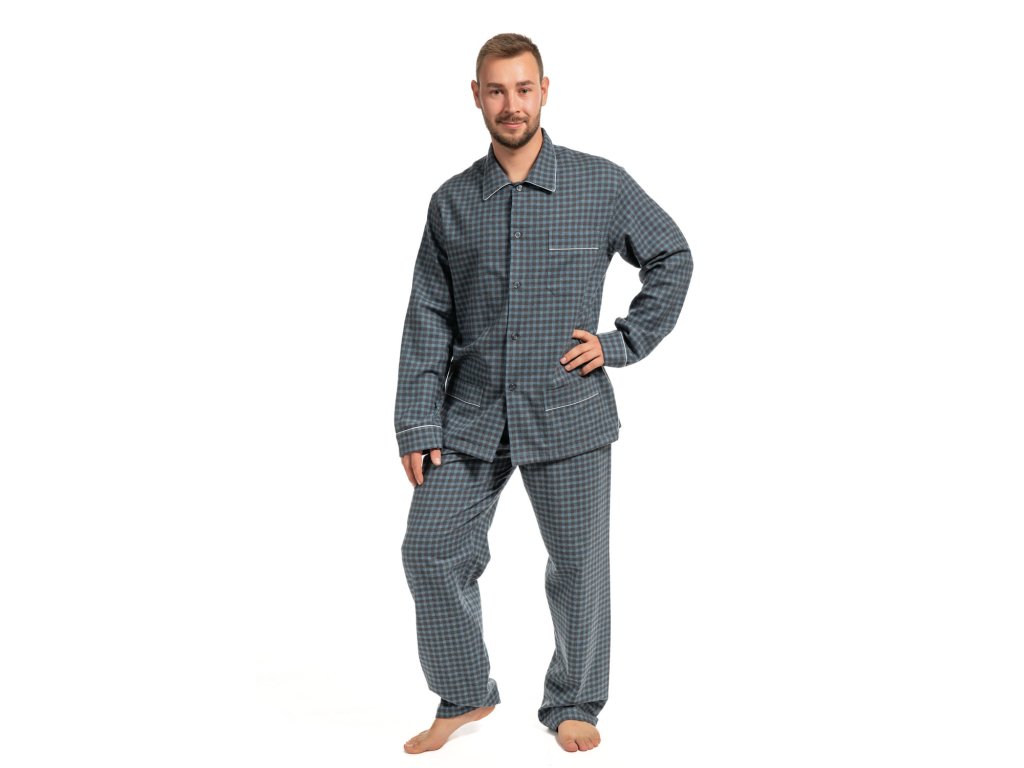 Elegantní pánské pyžamo na propínání v jednoduchém, ale přitom zajímavém provedení i zpracování. Pyžamo je s dlouhým rukávem i nohavicí, lemované ozdobnou paspulkou. Kabátek je s rozhalenkou, ale dá se zapnout až ke krku. Pyžamo má dvě kapsy v délce kabátku, jednu na prsou s ozdobnou lemovanou lištou. Kalhoty v pase do prošité gumy s knoflíky a rozparkem.