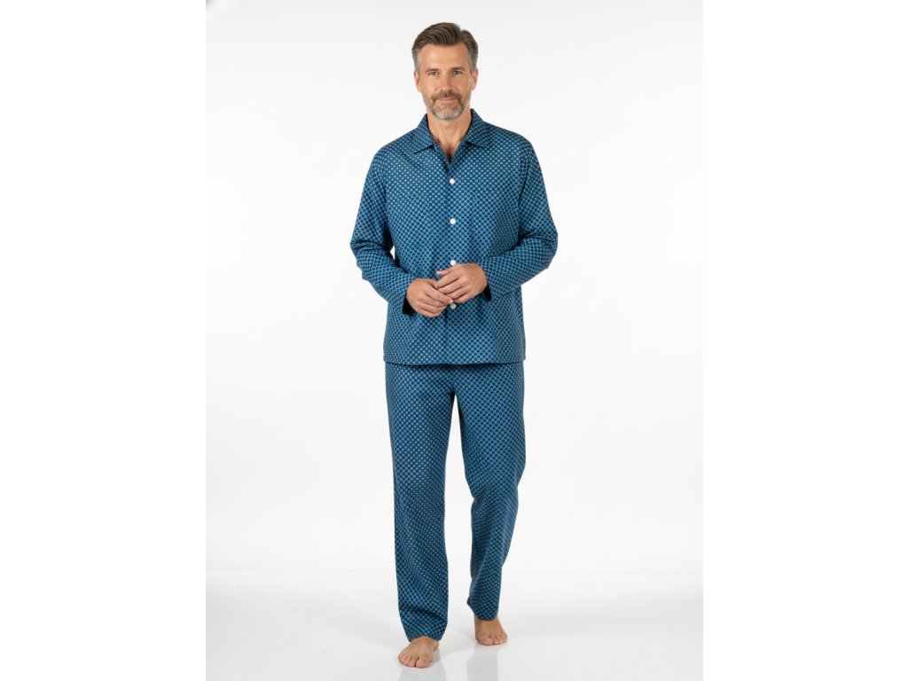 Pánské pyžamo Karel na knoflíky, s dlouhým rukávem i nohavicí. Kabátek je až ke krku a s kapsami, kalhoty v pase do gumy.