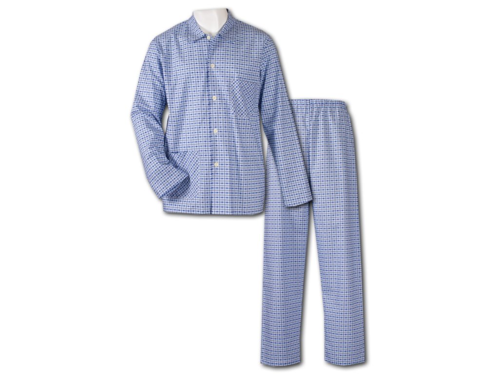 Pánské pyžamo Karel na knoflíky, s dlouhým rukávem i nohavicí. Kabátek je až ke krku a s kapsami, kalhoty v pase do gumy.