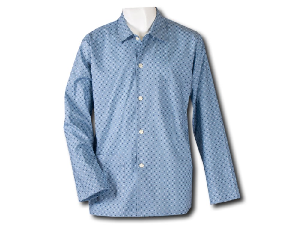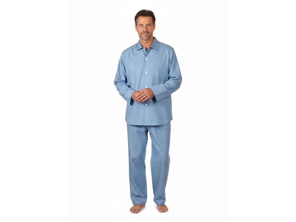 Pánské pyžamo Karel na knoflíky, s dlouhým rukávem i nohavicí. Kabátek je až ke krku a s kapsami, kalhoty v pase do gumy.