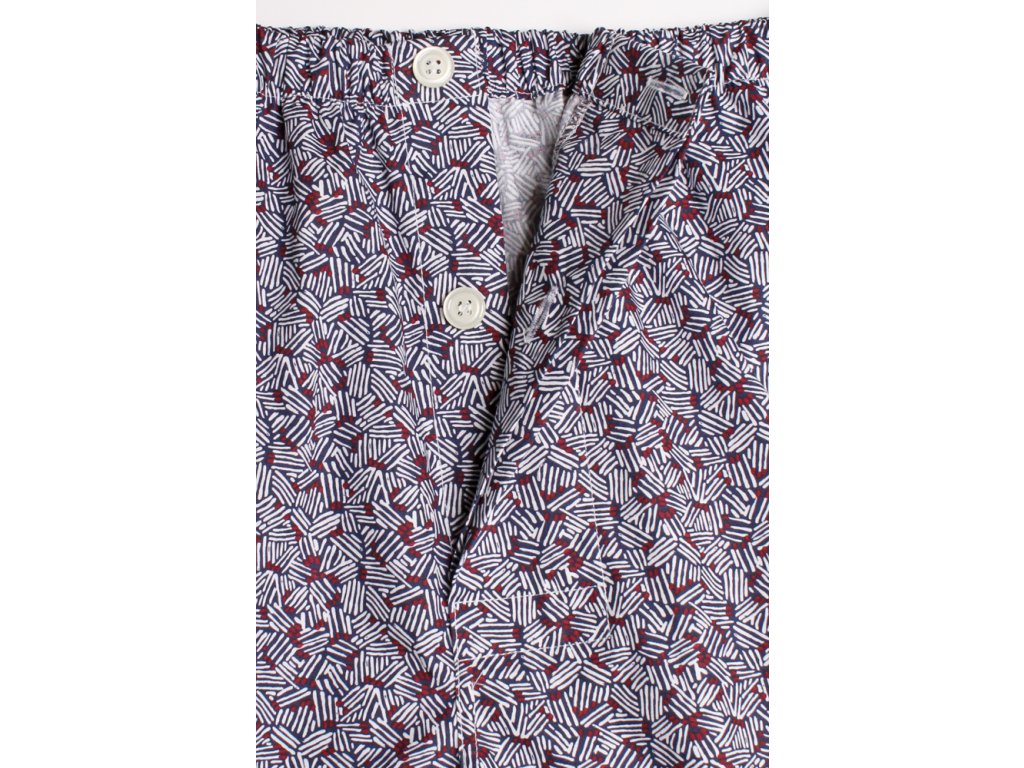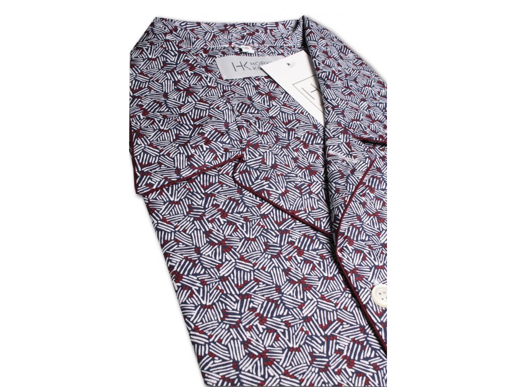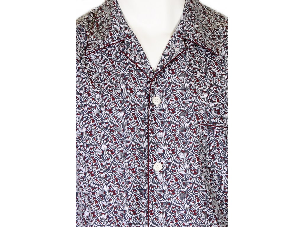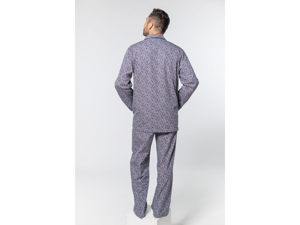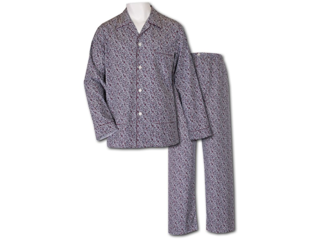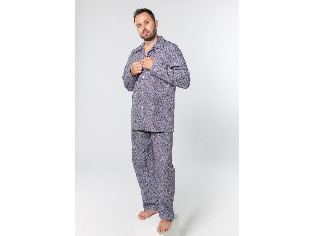 Elegantní pánské pyžamo na propínání v jednoduchém, ale přitom zajímavém provedení i zpracování. Pyžamo je s dlouhým rukávem i nohavicí, bohatě lemované ozdobnou paspulkou. A víte, že na jedno pyžamo je potřeba až 4m lemovky!? Kabátek je s rozhalenkou, kapsami a zdobený rukáv manžetou. Kalhoty v pase do gumy s rozparkem na dva knoflíky. Dokonalé zpracování.