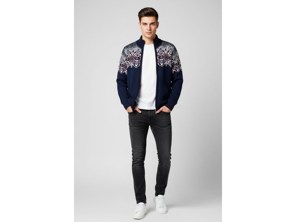 Norský vzor: Tento tradiční vzor zahrnuje geometrické tvary, jako jsou hvězdy, sněhové vločky a další symboly inspirované severskou kulturou. Vzor je obvykle pletený v kontrastní barvě, například tmavě modré nebo červené, která vyniká na bílém pozadí.