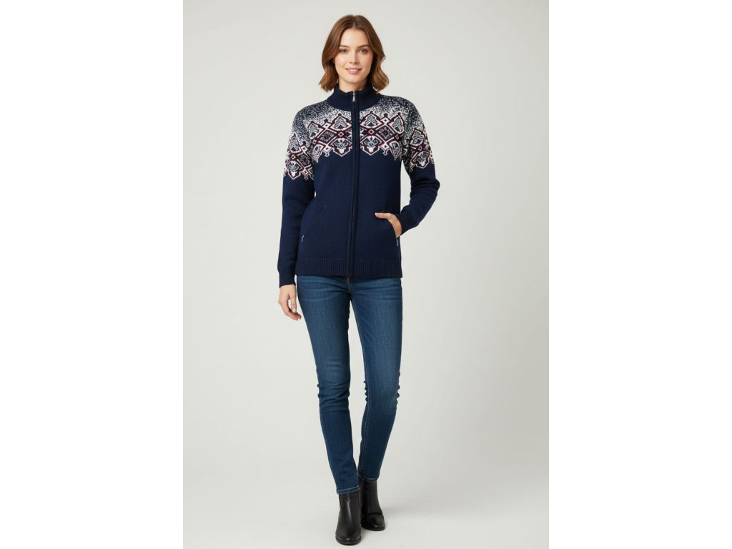 Ikonický zimní svetr v čistě bílé barvě s tradičním norským žakárovým motivem přes hrudník a rukávy. Středně silná pletenina příjemně hřeje, drží tvar a díky žebrovaným nápletům na lemu, manžetách a u krku dobře sedí. Nadčasový kousek pro hory i město. Jedná se o ikonický design inspirovaný norskou lidovou tradicí pletení.